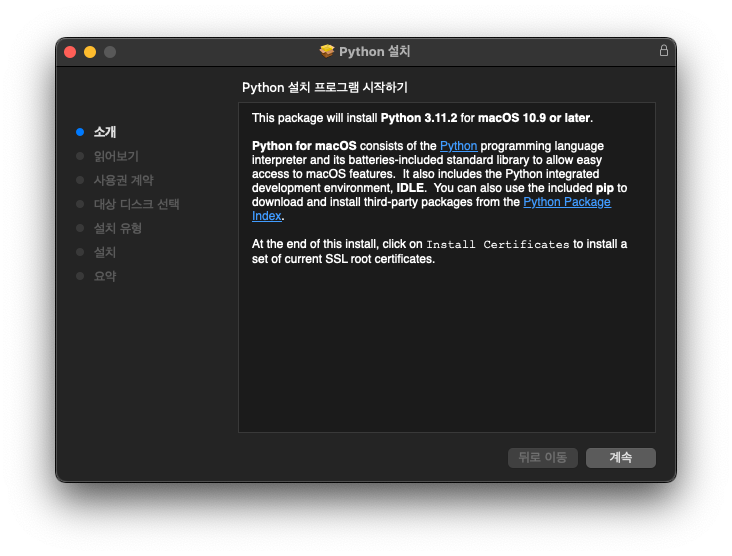 다운로드한 .pkg 파일을 실행한다. 계속 버튼과 동의 버튼을 누르다보면 설치가 완료된다.
