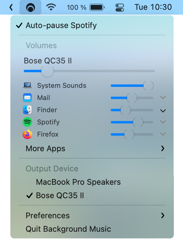 각 앱마다 소리를 조정할 수 있는 앱이다. 이 앱 역시 Windows에서 기본으로 제공하는 기능과 비슷한 역할을 한다. 공식 웹사이트에서 패키지 파일을 다운받아 설치하거나 Homebrew을 이용하여 터미널에서 다음 명령어를 사용해 설치할 수 있다.