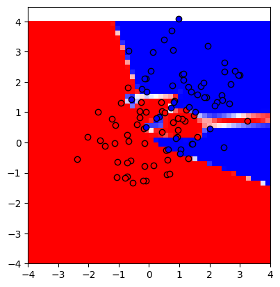 분류한 다음엔 x와 y가 -4 부터 4까지 모든 점들에 대해 모델이 점을 빨간색으로 구분하는지 파란색으로 구분하는지 알아볼 것이다.