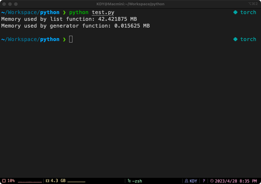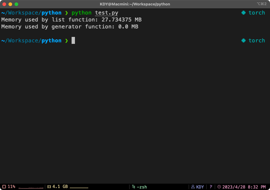 파일 이름을 test.py로 저장하고 코드를 실행했을 때 yield을 사용하면 메모리를 거의 사용하지 않은 것을 확인할 수 있다.