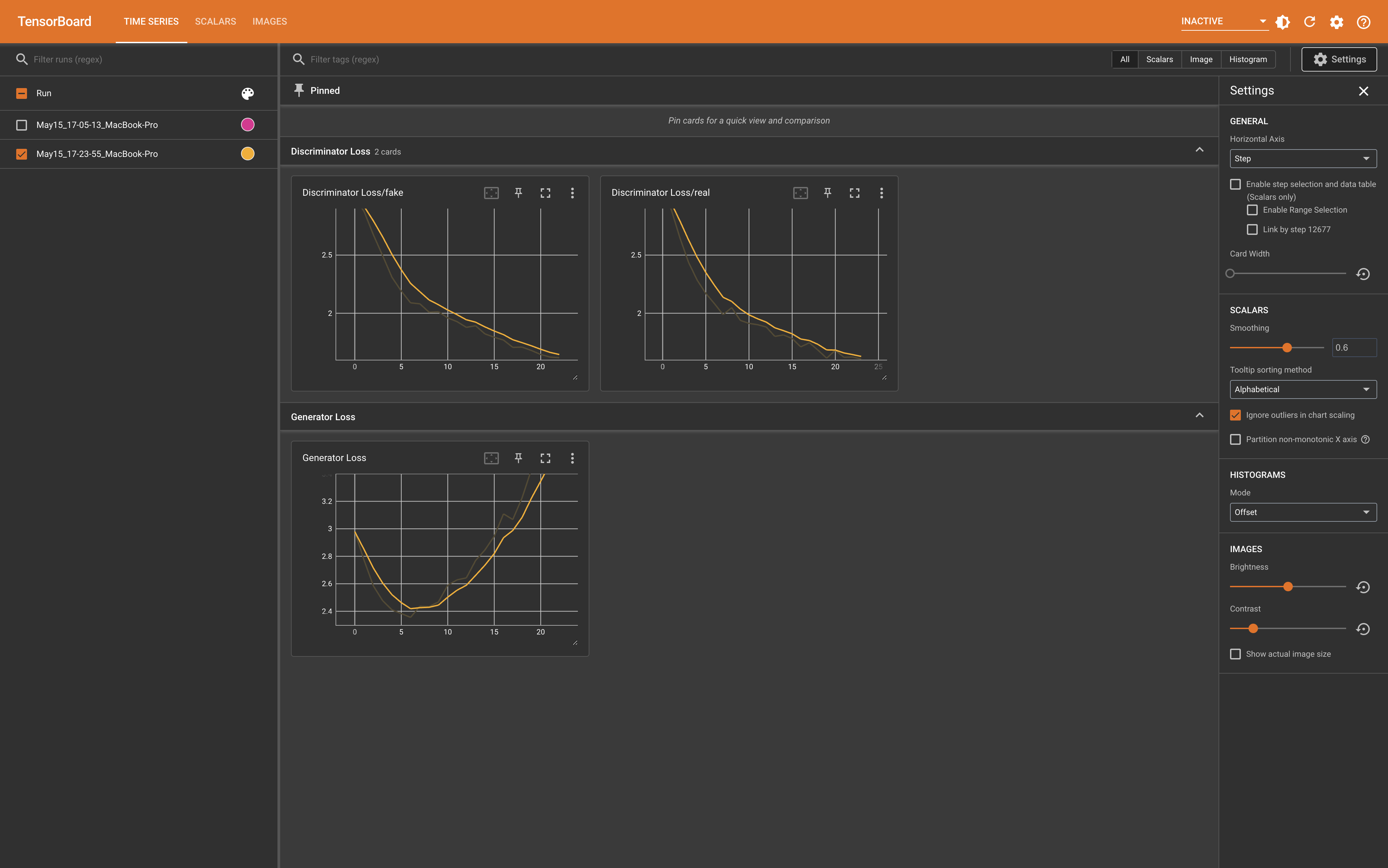 그 다음 웹브라우저를 열고 http://localhost:6006을 들어가면 아래와 같이 학습을 모니터링할 수 있다. (이미지가 이상한 이유는 아직 학습이 충분하게 되지 않았기 때문. GAN 포스팅이 아니라 텐서보드 포스팅이므로 넘어가자)